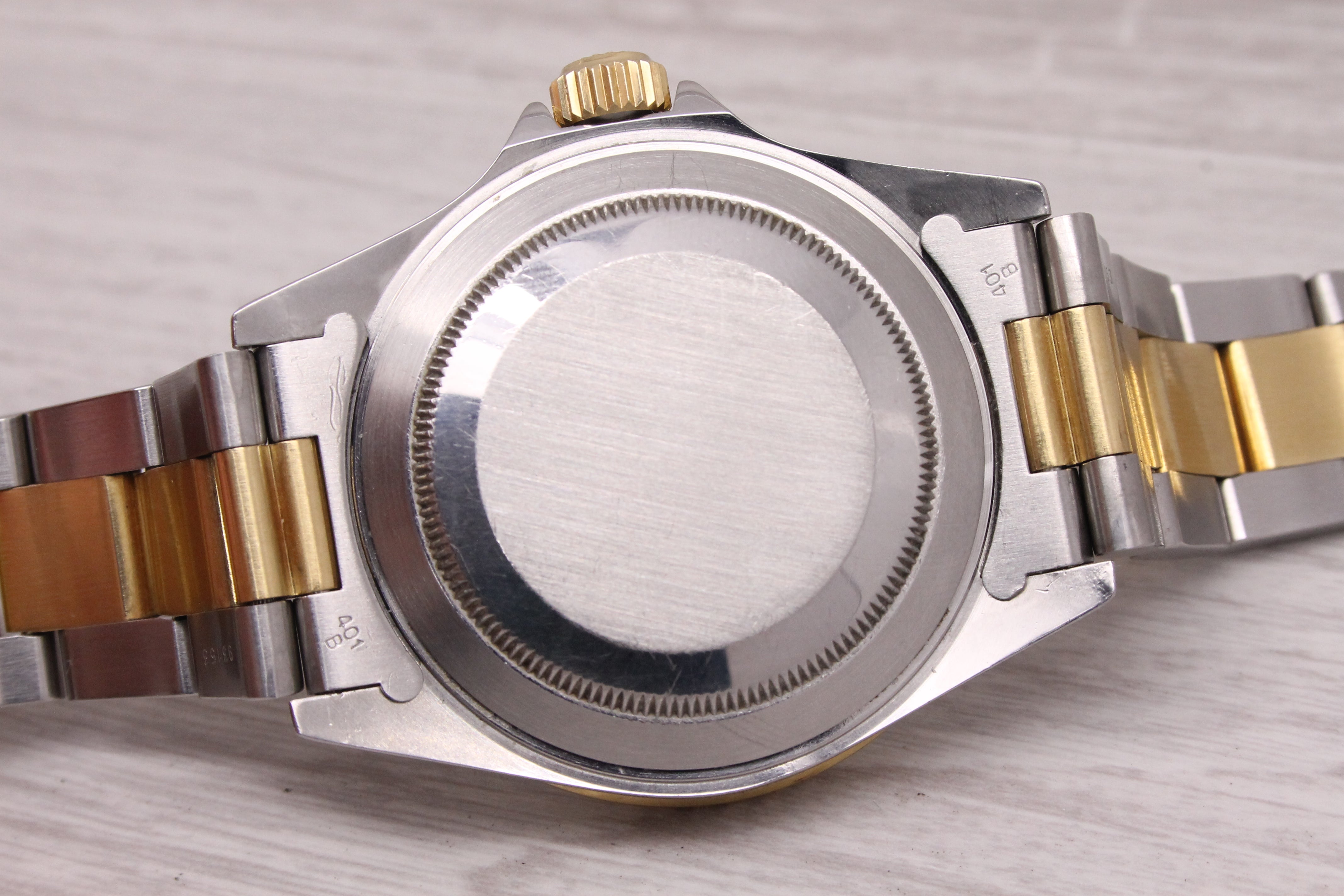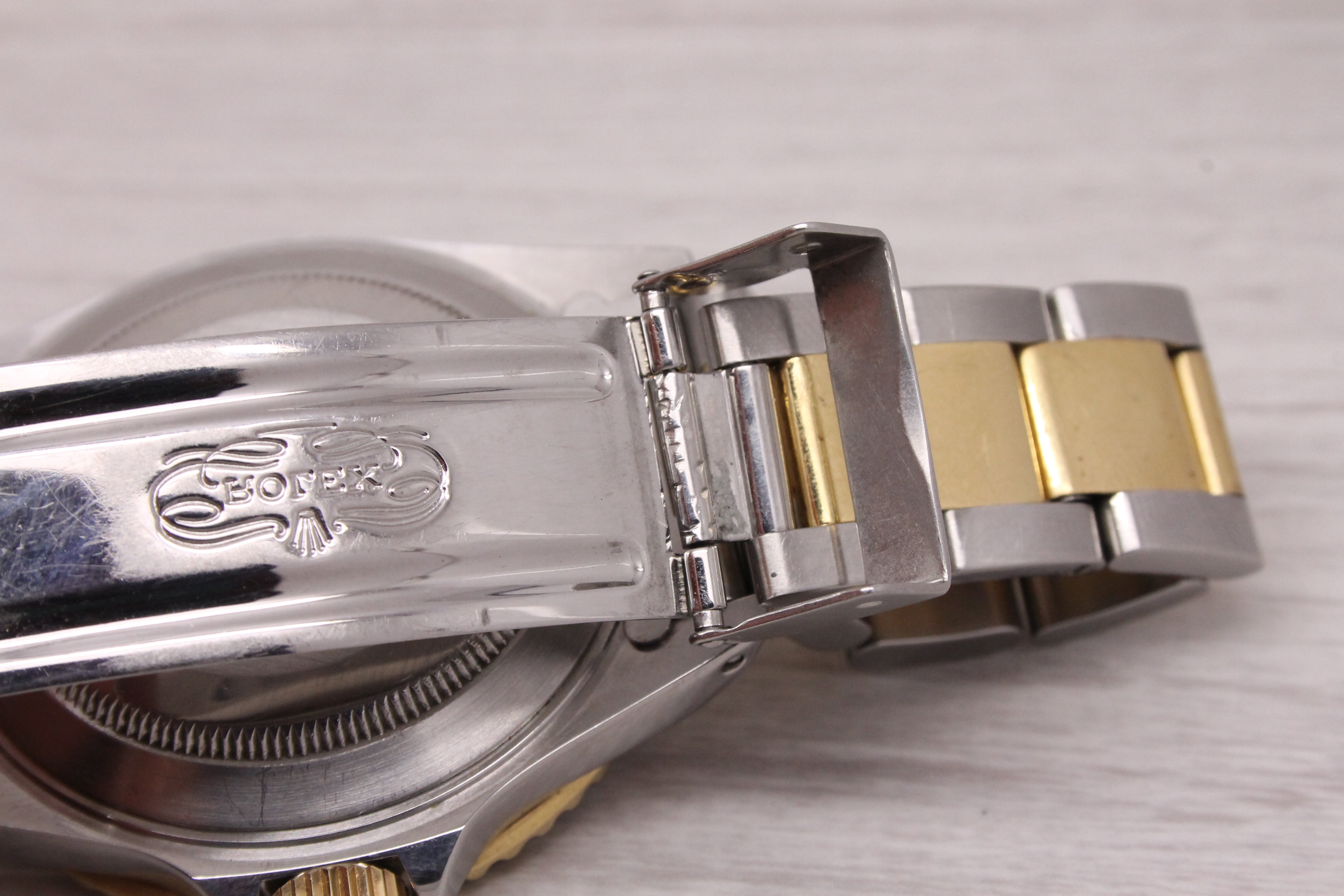 The watch is currently working including winding and setting fine. The watch has run for the day and kept good time although total accuracy and duration cannot be guaranteed as the service history is unknown. The watch comes on the original 93153-18 two tone bracelet with 401B endlinks. The bracelet will fit up to a 7 1/2" inch wrist. A portion of the bracelet near the clasp lock is a bit chewed up (see pics). The watch comes with the original boxes, typed papers, serial hang tag, and manuals.