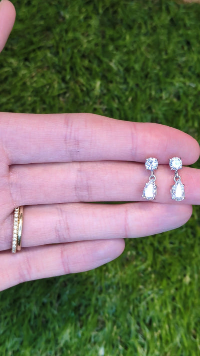 These gorgeous, classic earrings have diamond teardrops hanging from diamond set stick posts. Each round and pear cut diamond is displayed in a pronged setting with a ported back, allowing light to add a brilliant sparkle.