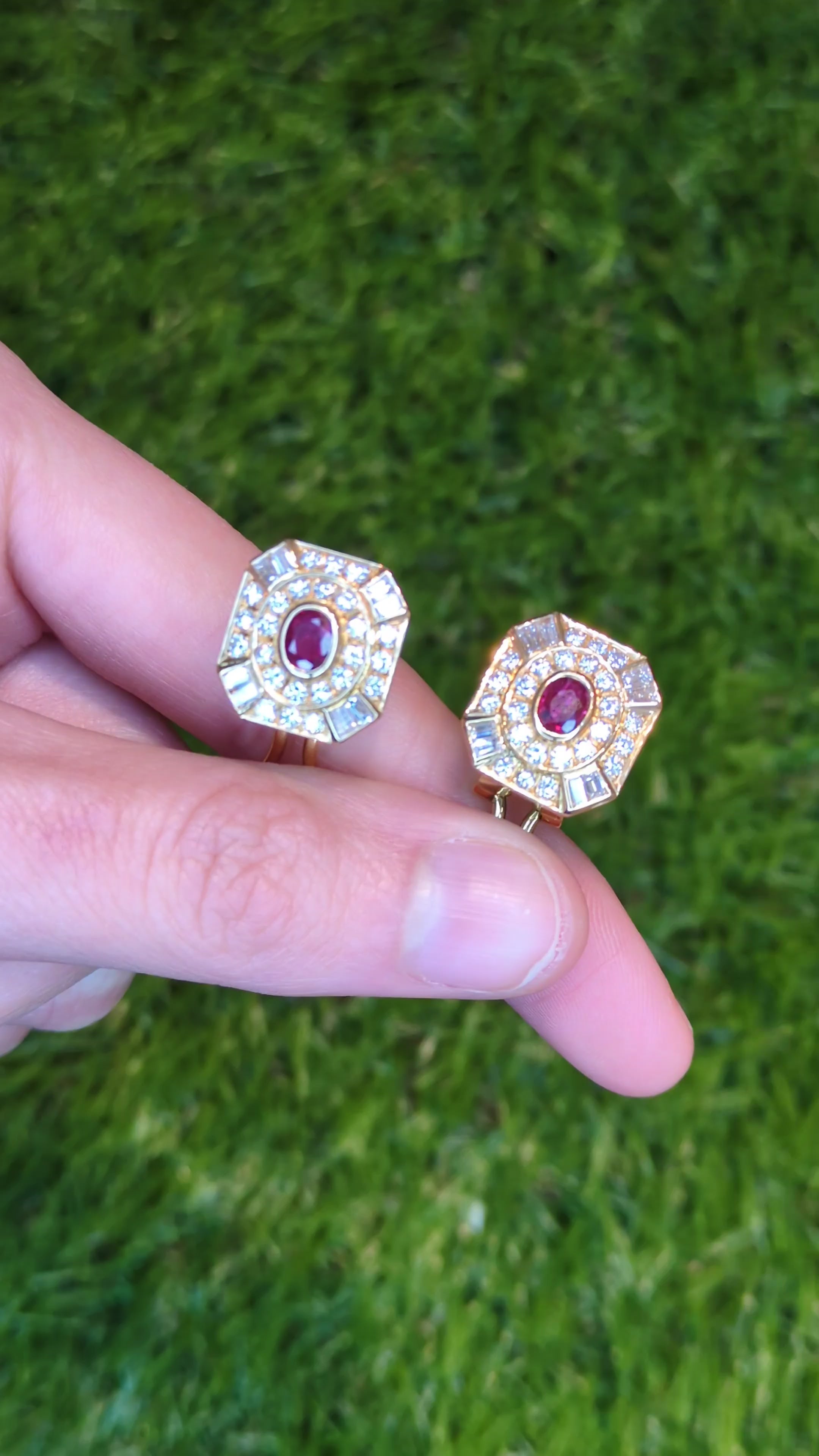 These gorgeous eye catching earrings feature sparkling diamonds creating a tiered halo design which frame genuine rubies. The deep red rubies have a nice color contrast with the white diamonds. The precious gems are set in yellow gold and secure with easy to wear stick posts and omega backs