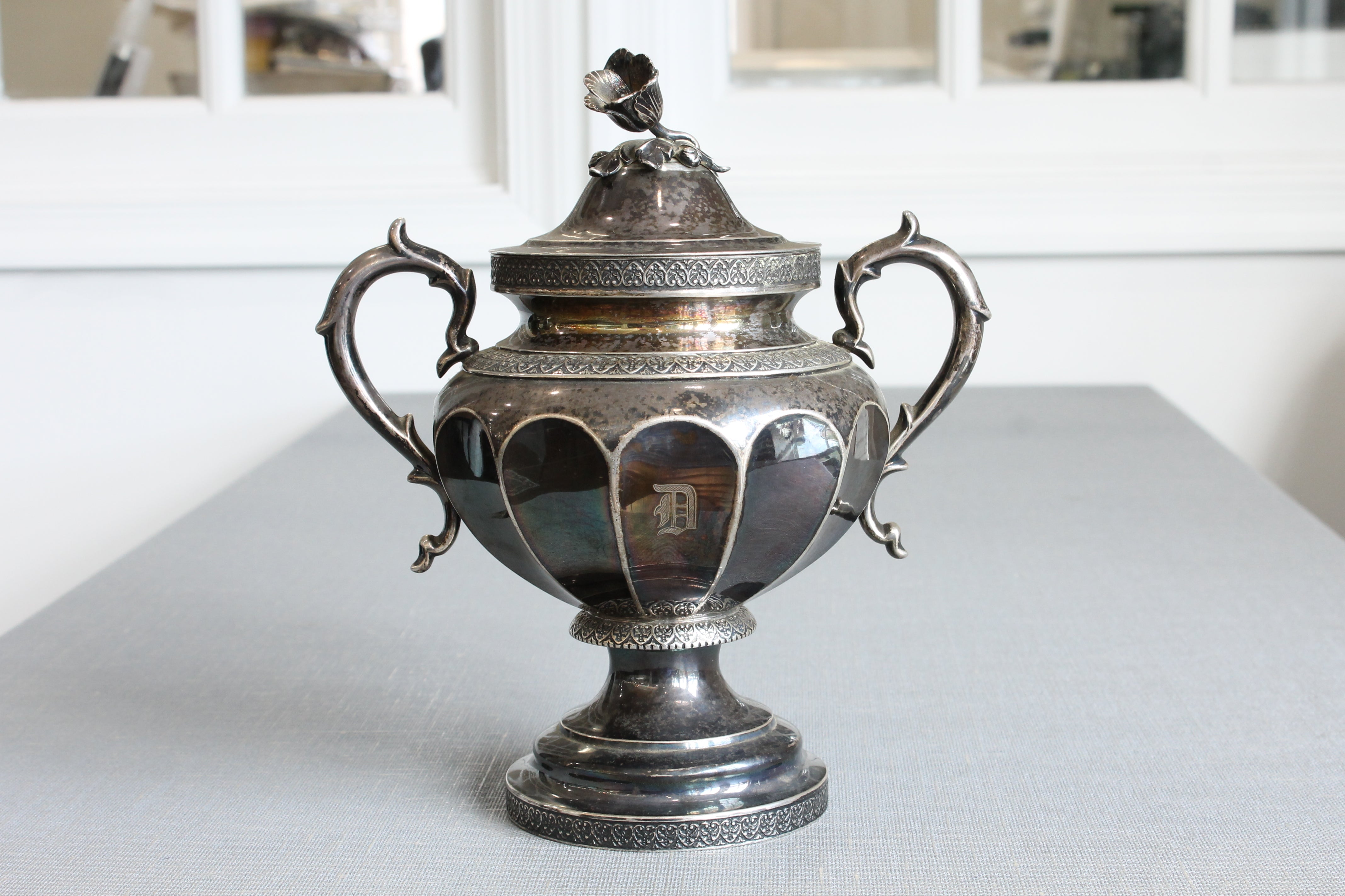 This is an extremely nice antique sterling silver sugar bowl by Ball Tompkins & Black, Successors to Marquand & Co, New York. The 10" handled bowl is complete with the flower adorned lid. The bowl has a "D" monogram. The total weight is 1032.9 grams.