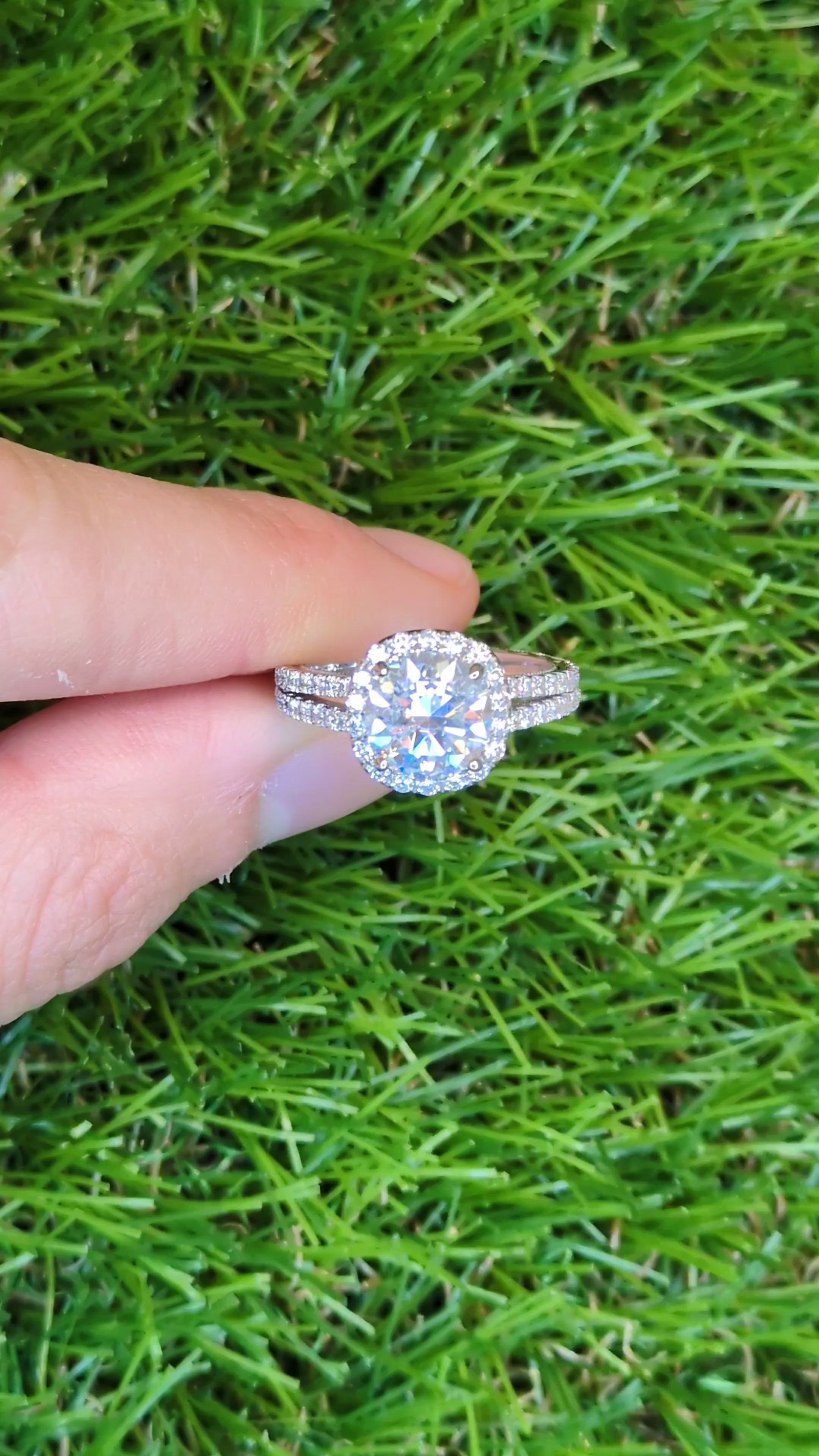 This beautiful ring is set with a Moissanite solitaire cradled in a four prong setting atop a halo of natural diamonds. The double band design is also accented by sparkling natural diamonds. The moissanite center could be displayed as is or replaced with a 8mm diamond. If you would like to replace the solitaire setting please send us a message and one of our associates would be happy to help.