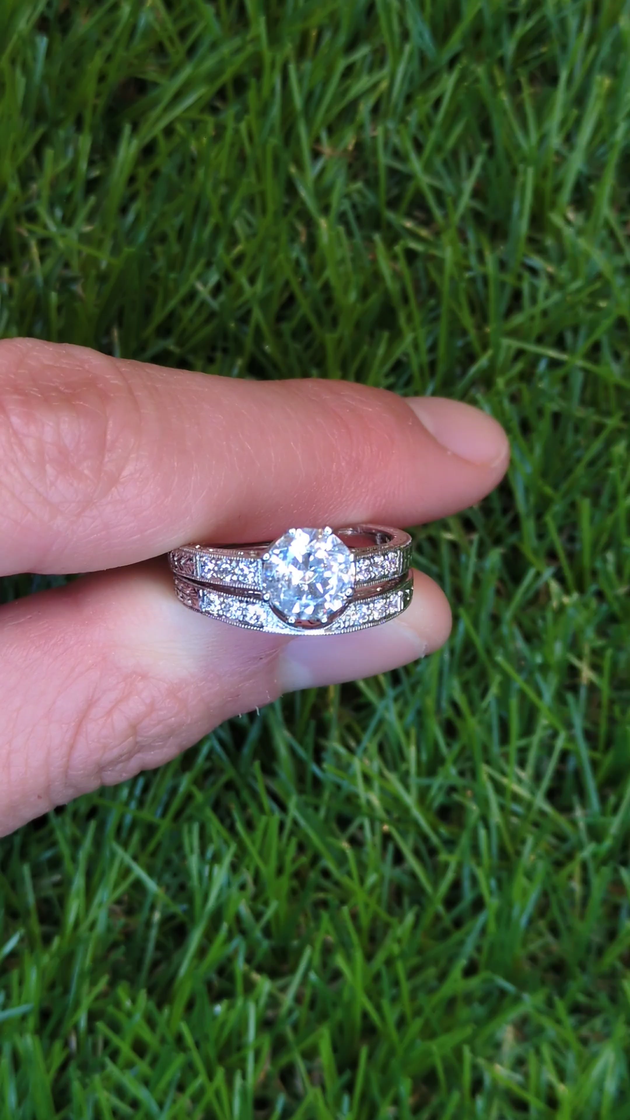This lovely ring is a semi mount designed to hold a Round 7.1 mm / 1.33ct diamond or stone of your choice. This ring is set with a place holder center stone. Please note the center stone is cracked.