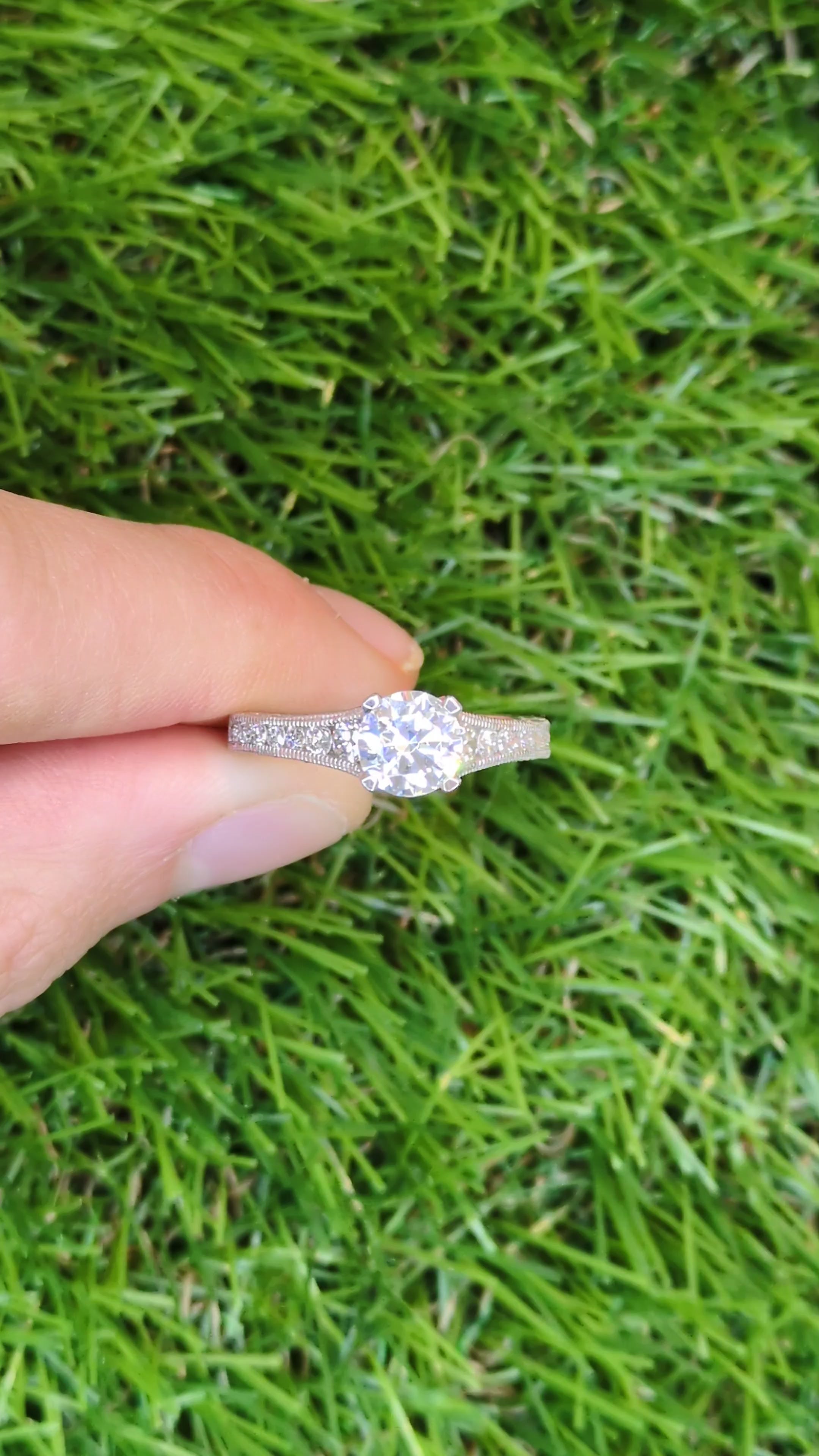 This lovely ring is a semi mount designed to hold a Round 6.5mm / 1ct diamond or stone of your choice. There is a placeholder stone set in the center of the ring. This lovely ring comes with it's original Tacori certificate of authenticity. The ring has a retail value of $5490, so don't pass up this amazing deal!